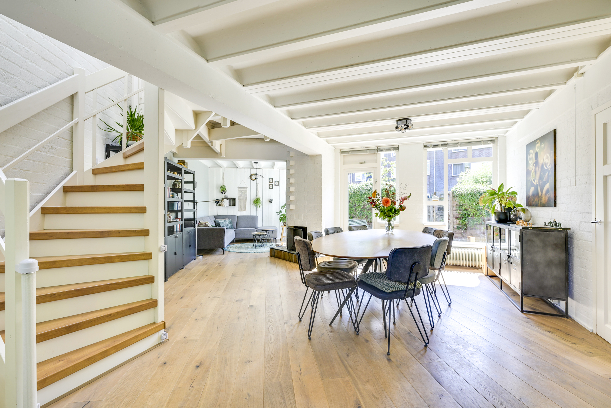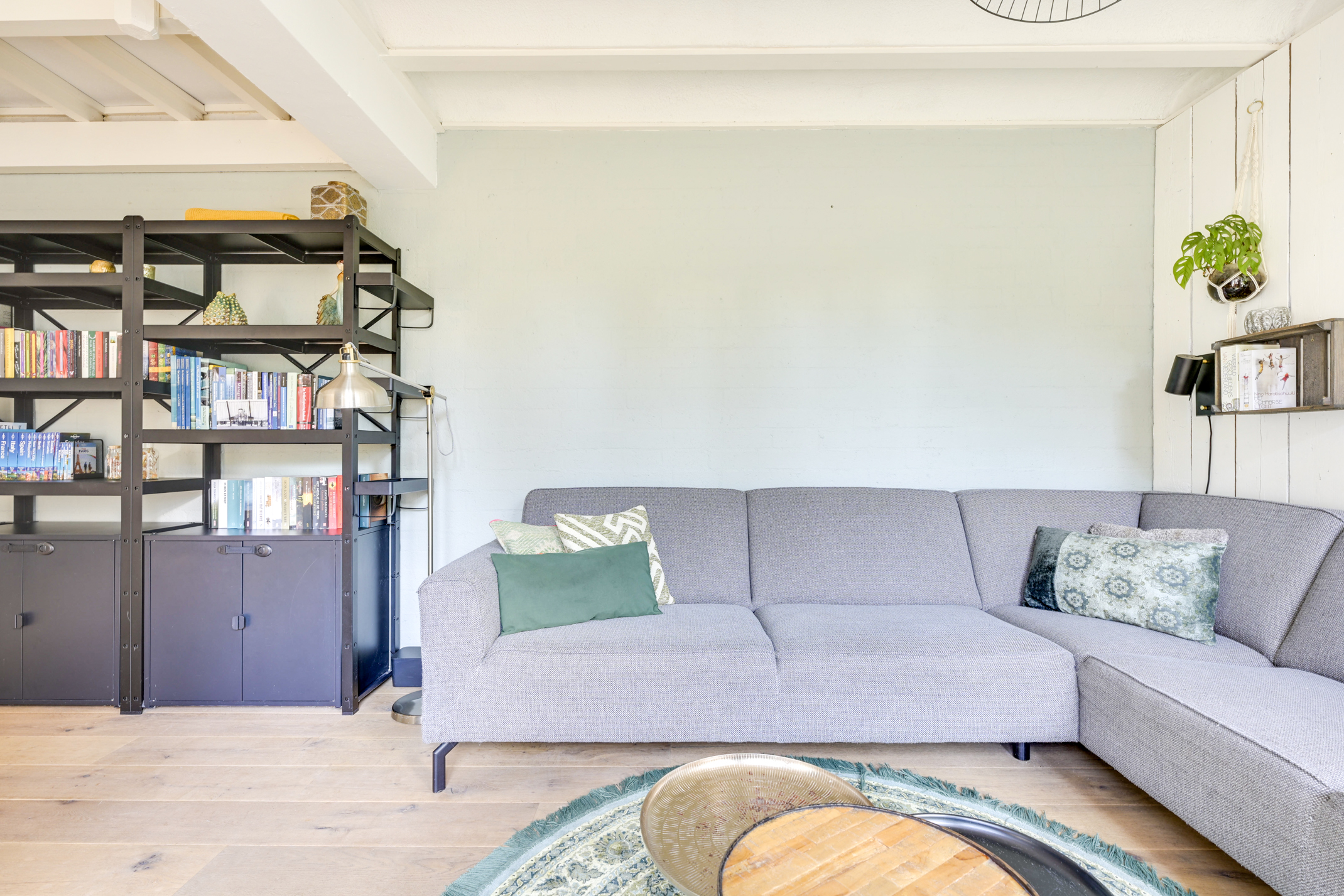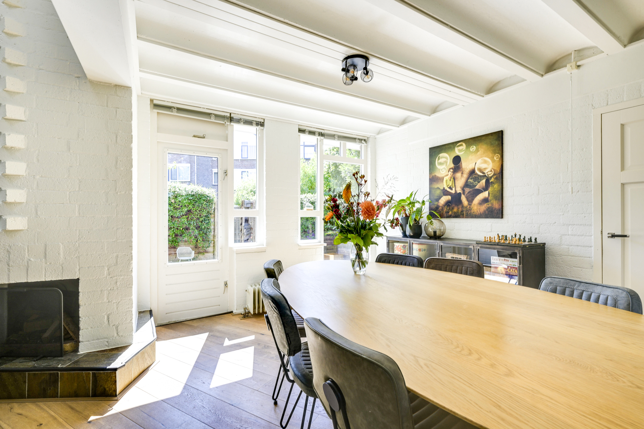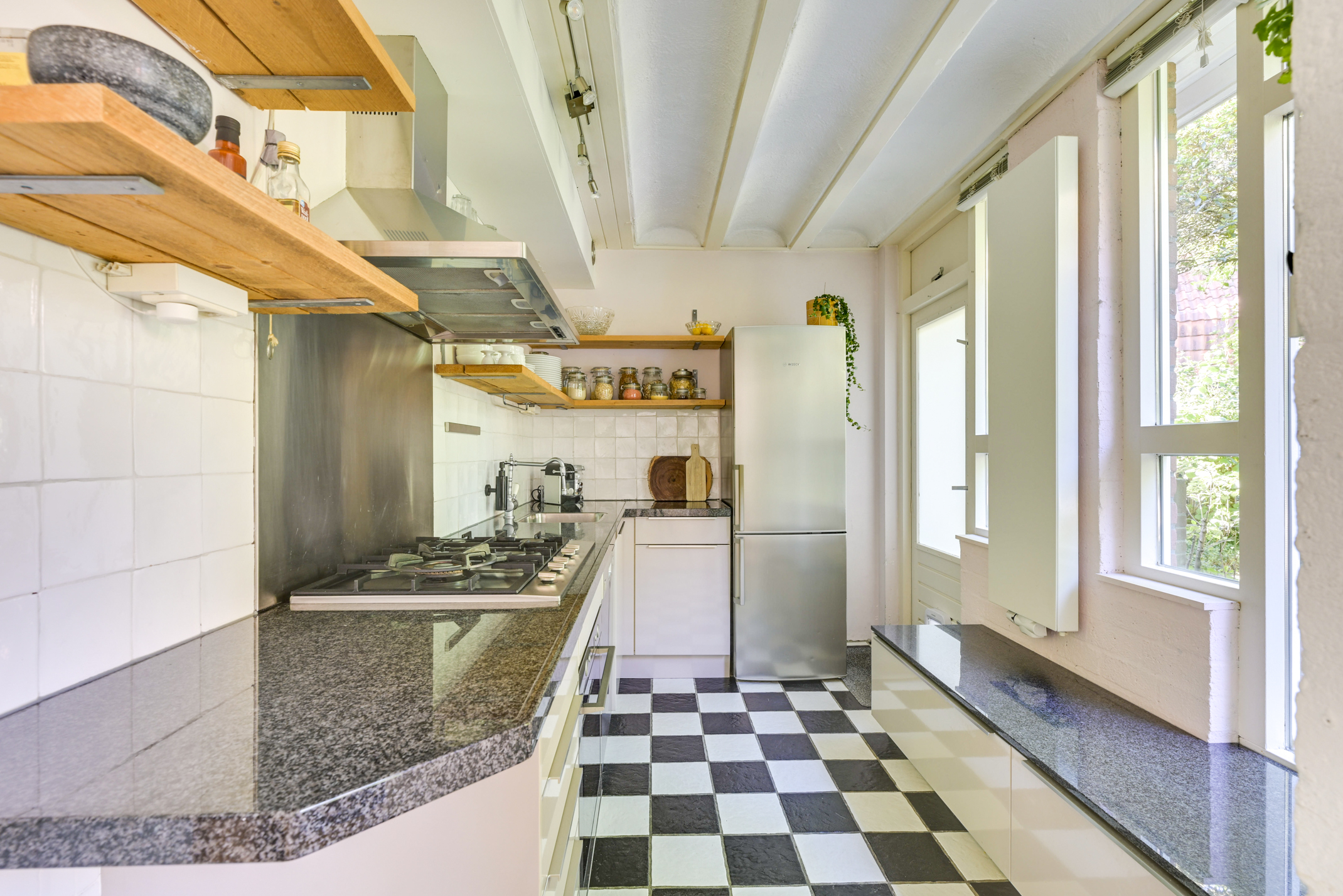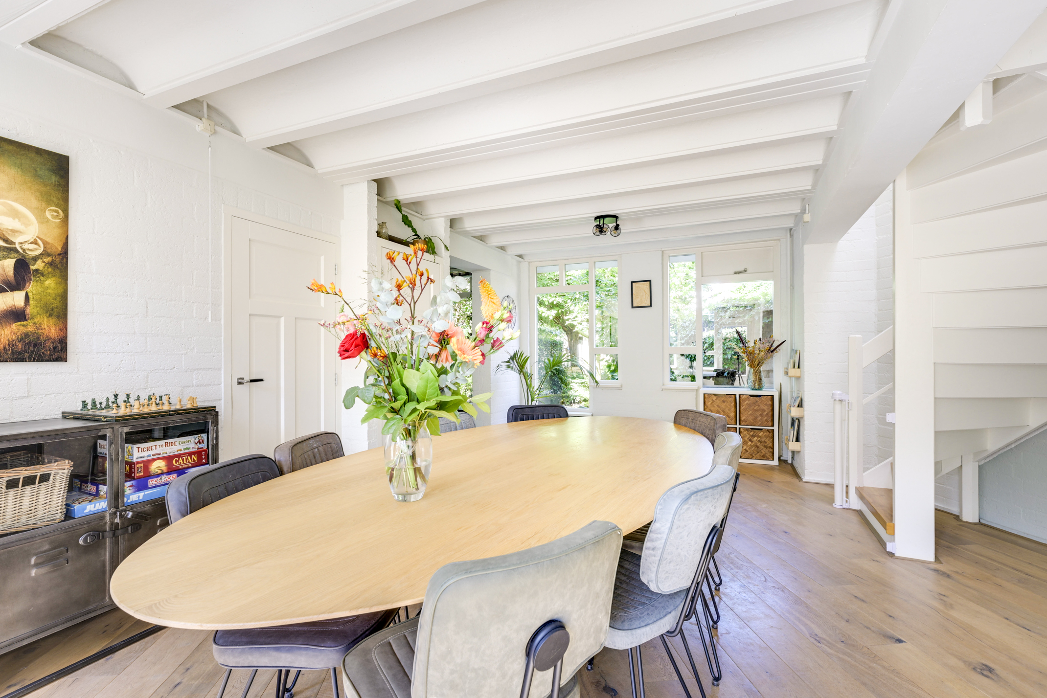 Vernieuwde hal met meterkast, moderne toiletruimte met hangend toilet, toegang naar de inpandige berging en woonkamer. Via mooie paneeldeur toegang naar de ruime en speelse woonkamer. Door de vele raampartijen is er een lichte en prettige woonkamer ontstaan. De woonkamer is circa 48m2 en biedt u de mogelijkheid om verschillende indelingen te maken. De woonkamer is voorzien van een vergrijsde eikenvloer, openhaard en vide partij. Tevens heeft de woonkamer op 2 verschillende plaatsen een deur voor gemakkelijke toegang naar de voortuin. Aansluitend is de halfopen keuken gesitueerd welke is voorzien van een moderne, L-vormige inbouwkeuken met de diverse inbouwapparatuur. Vanuit de keuken heeft u toegang tot de tuin.