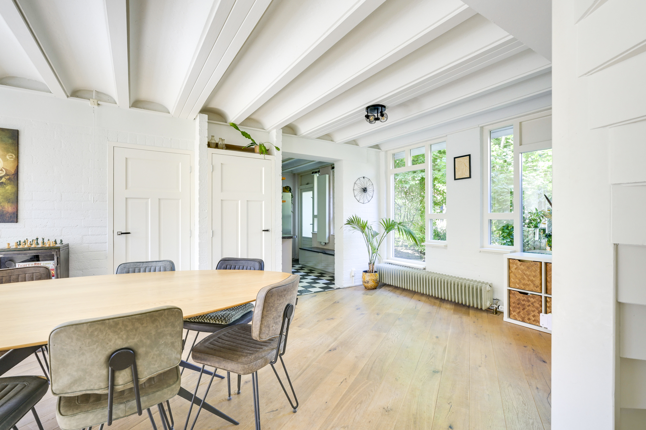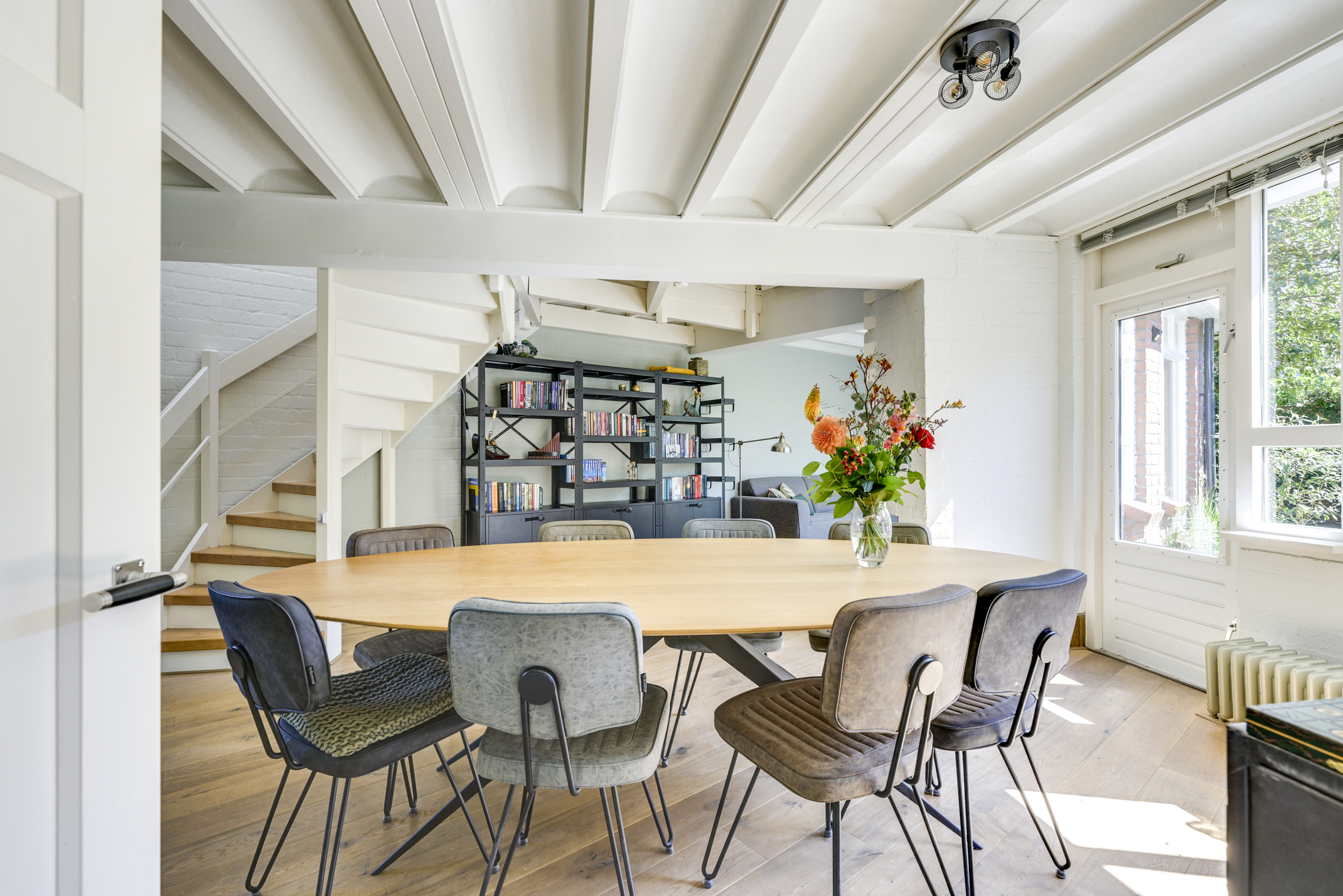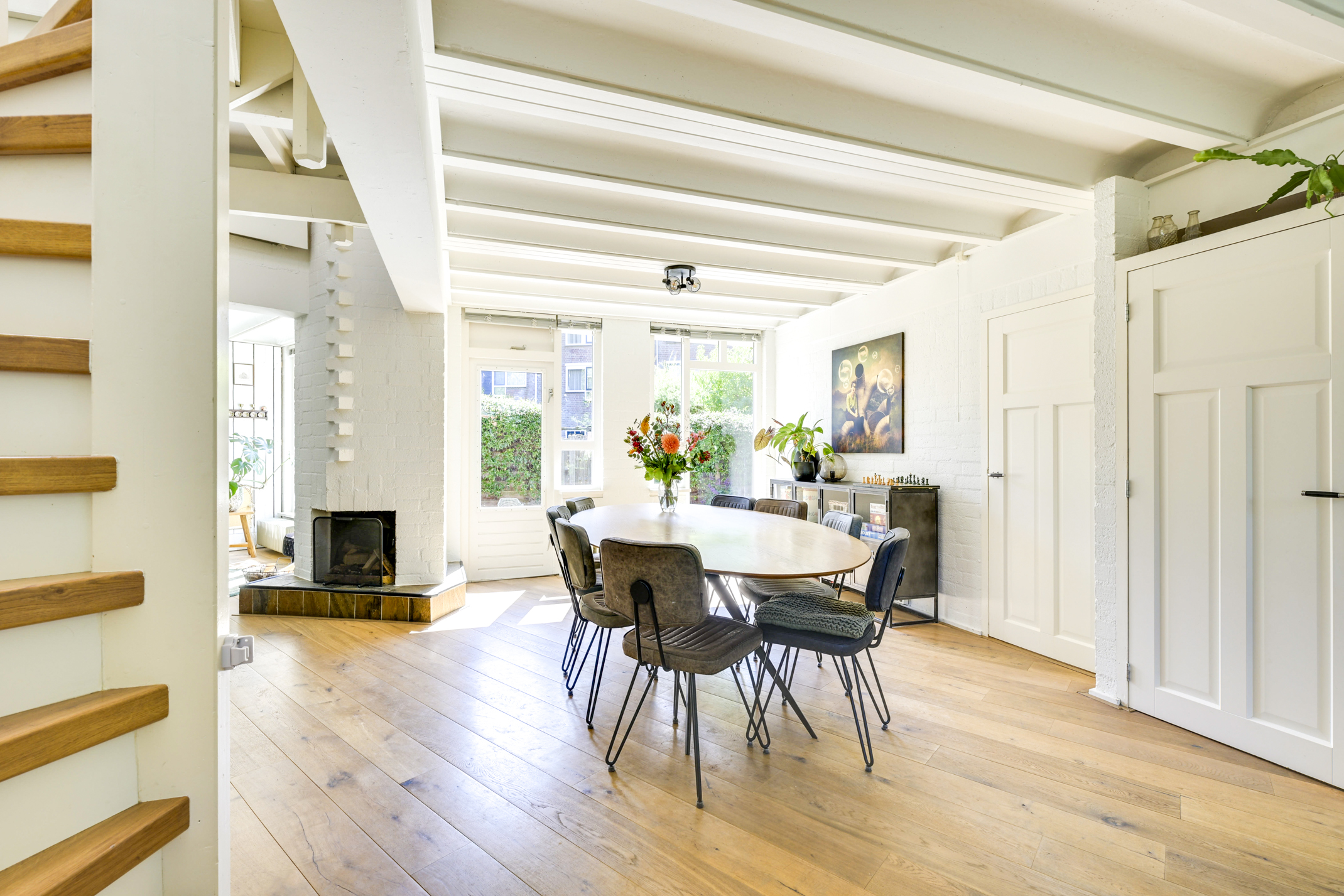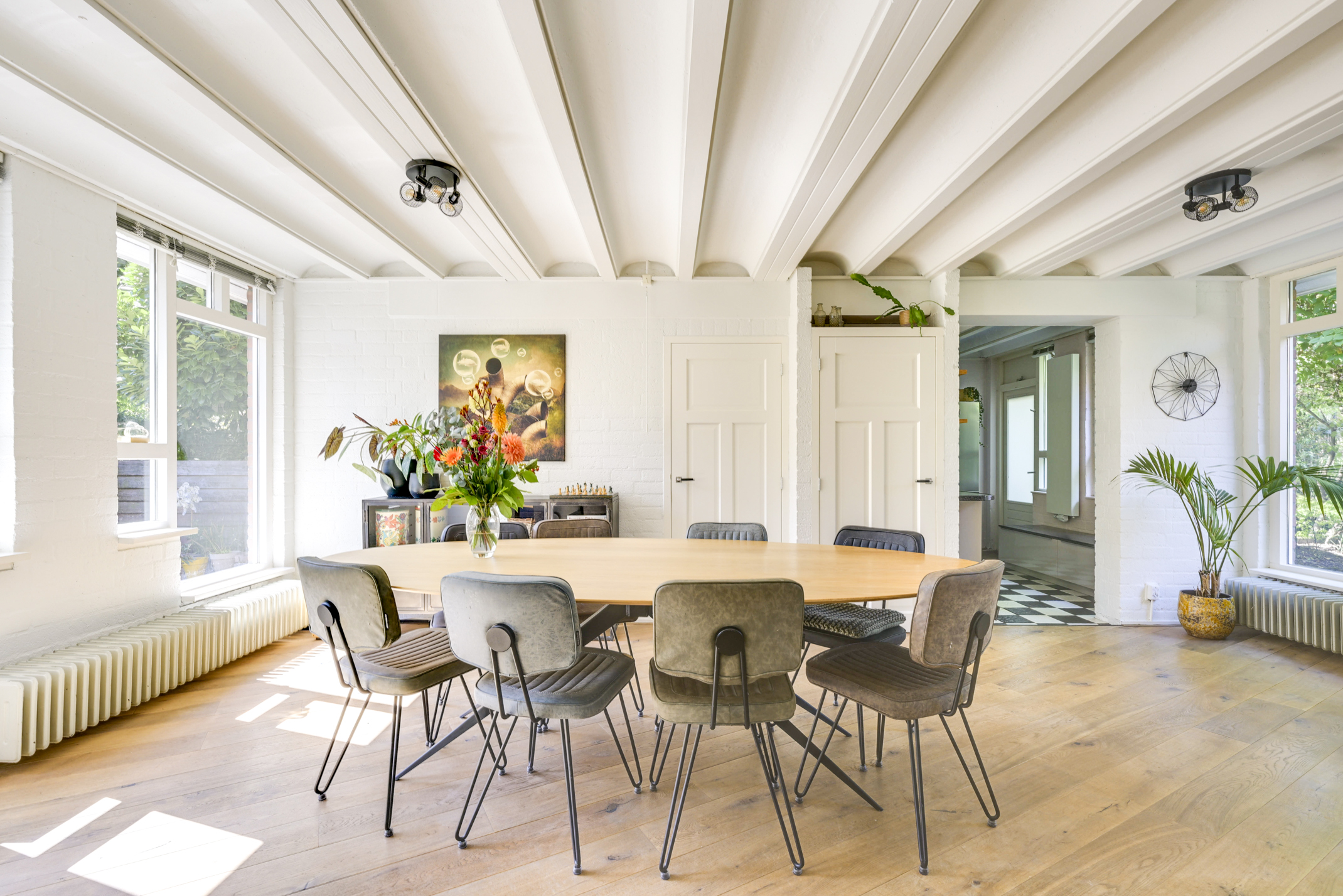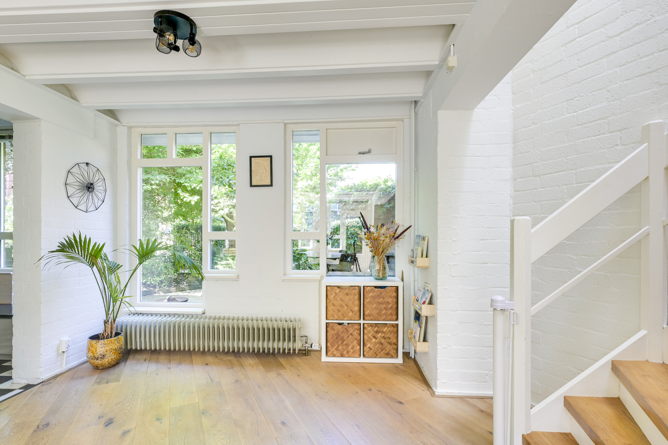 Vernieuwde hal met meterkast, moderne toiletruimte met hangend toilet, toegang naar de inpandige berging en woonkamer. Via mooie paneeldeur toegang naar de ruime en speelse woonkamer. Door de vele raampartijen is er een lichte en prettige woonkamer ontstaan. De woonkamer is circa 48m2 en biedt u de mogelijkheid om verschillende indelingen te maken. De woonkamer is voorzien van een vergrijsde eikenvloer, openhaard en vide partij. Tevens heeft de woonkamer op 2 verschillende plaatsen een deur voor gemakkelijke toegang naar de voortuin. Aansluitend is de halfopen keuken gesitueerd welke is voorzien van een moderne, L-vormige inbouwkeuken met de diverse inbouwapparatuur. Vanuit de keuken heeft u toegang tot de tuin.